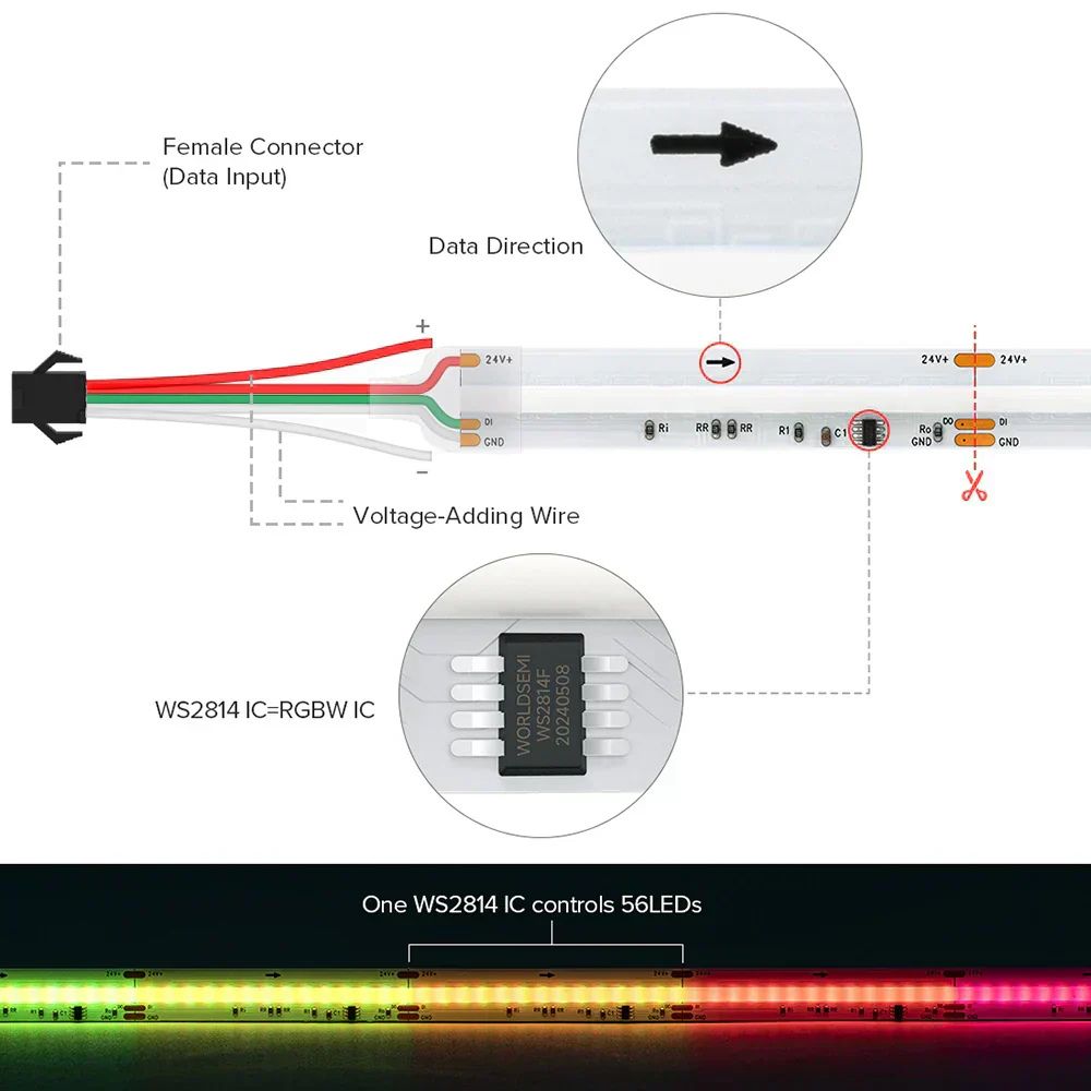 For korrekt funktion kræves en digital SPI-controller, som understøtter WS2814 IC. Sørg for at vælge en passende controller, der matcher dit system og dine ønskede lyseffekter.